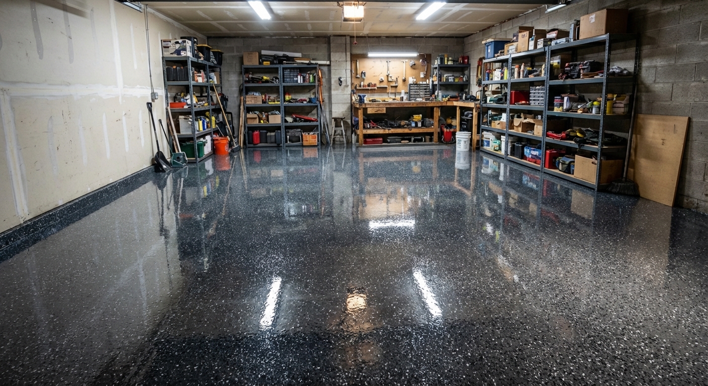 Preview metallic flake, solid color, or quartz epoxy on real garage floors