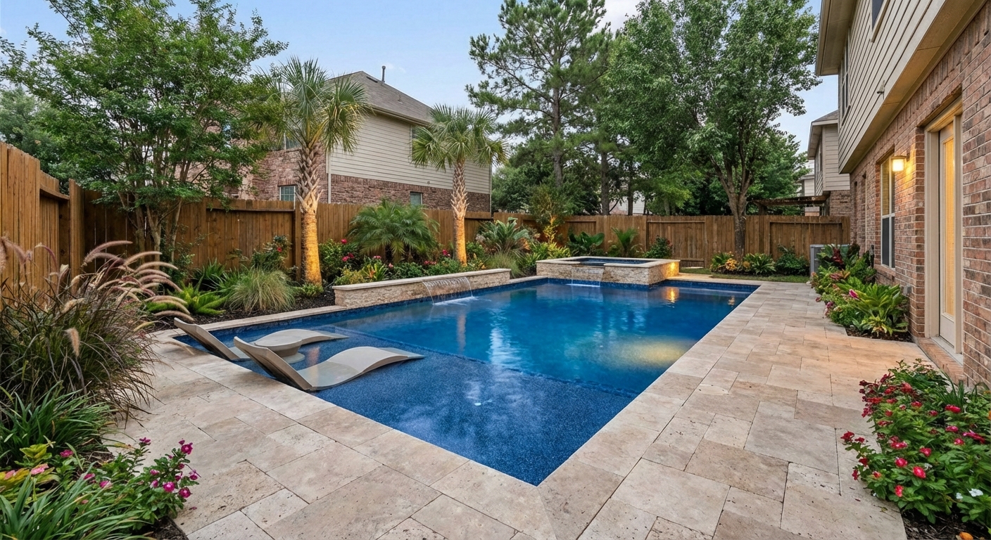 Upload the homeowner's backyard. AI renders the finished pool — your proposed shape, pebble finish, travertine deck, raised spa with spillover, professional landscaping — all on their actual yard. They stop saying "we're still thinking about it."
